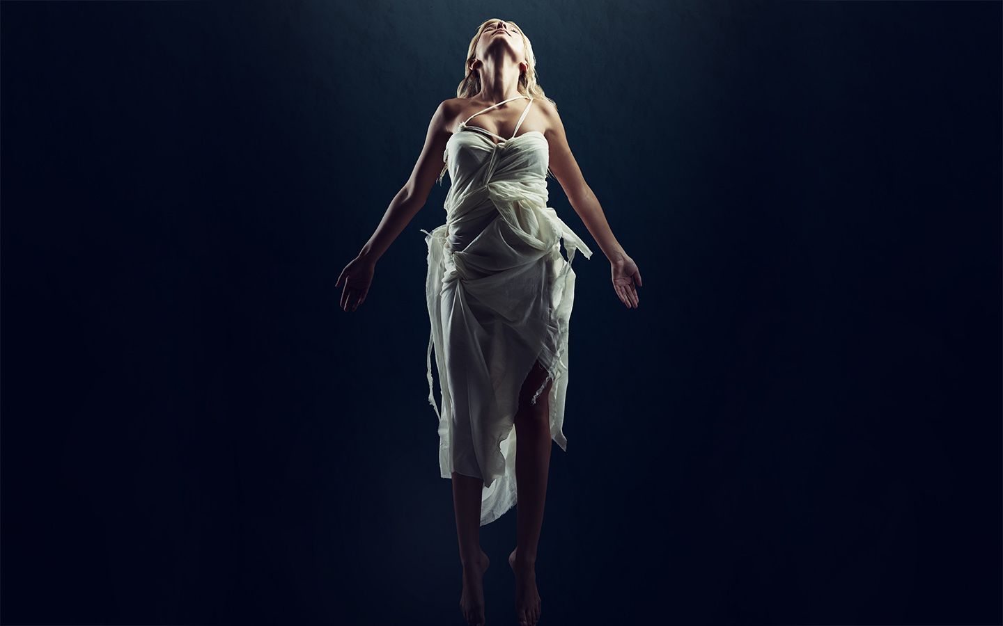Color face Header-01 A gorgeous young woman floating upward isolated against black Original size is 1440 × 900 pixels